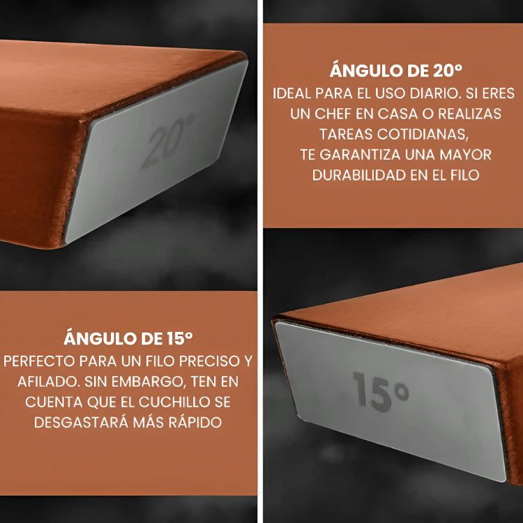 Usa 15° para precisión quirúrgica o 20° para un filo duradero. Tú eliges cómo quieres cortar: fino o contundente.